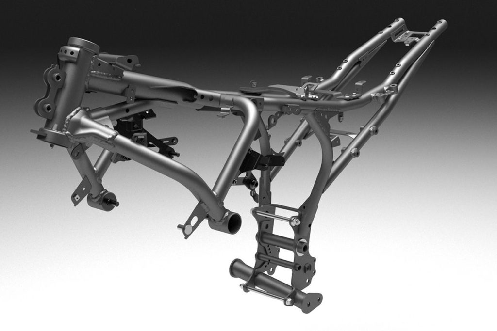 車體結構也進行全面更新。背骨型鋼管車架在維持重量不變的前提下,幾乎重新設計了所有部位的管路配置與肉厚,提升了縱向、橫向及扭轉剛性。負責調整整體剛性平衡的中心加強件也經過優化。此外,鋼製沖壓非對稱搖臂改採全新設計,由傳統的鏤空型改為切削上緣的造型,並透過重新調整多連桿比例與板厚,提升接地感與穩定性。