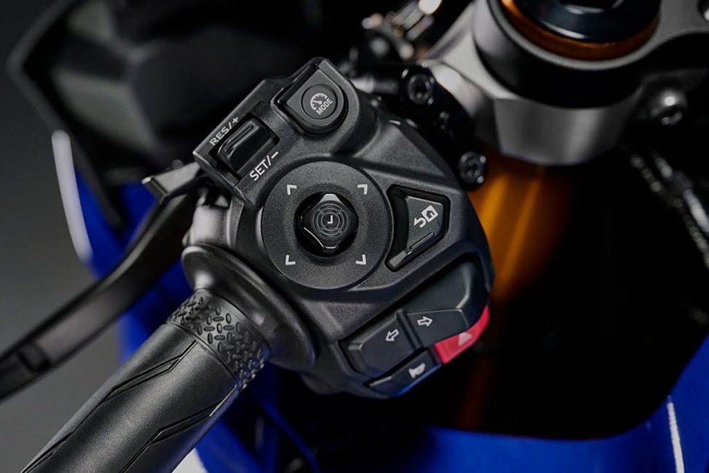 騎乘三角進行微調,手把位置較舊款上移 3.6mm、後移 8.4mm,燃料箱蓋後端傾斜度改得更平緩,增加上半身伏貼度與體重轉移的自由度。座椅高度降低 5mm,新設計的座墊邊緣更銳利,並採用與 YZF-R1、R9 相同的防滑壓紋。此外,配備 14 段可調離合器拉桿、新形狀換檔踏板與腳跟防護板,並新增三連閃與連續閃爍兩段式方向燈功能,細節考究。