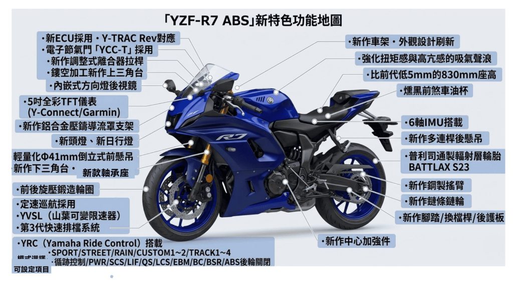 從傳統的鋼索式油門進化為電子節氣門(Ride-by-Wire),並全新搭載能精密偵測車身動態的 6 軸 IMU。除了補足舊款缺失的循跡控制系統(TCS)外,更加入可依喜好調整動力輸出與電控介入程度的 YRC(Yamaha Ride Control 騎乘控制系統),以及能緩解過度引擎煞車的 BSR(Back Slip Regulator滑動抑制) 系統。