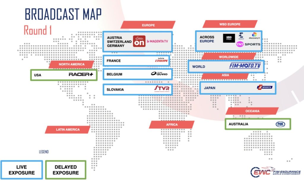本賽季迎來了官方串流平台 FIM MOTO.TV 的正式啟用。該平台將向全球 110 多個國家轉播 EWC 賽事,範圍涵蓋美洲、非洲、中東以及亞洲與大洋洲的部分地區,確保沒有當地專屬轉播商的區域,車迷依然能收看比賽。