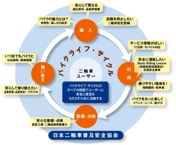 本二普協所標榜的「摩托車生活週期」角色圖。為了讓騎乘過程更圓滿,協會全方位地展開各項活動。詳情請參閱官網( https://www.jmpsa.or.jp/)。