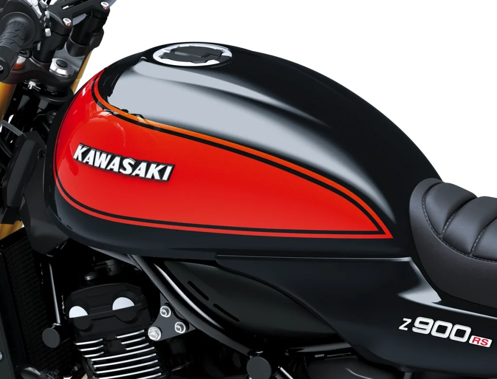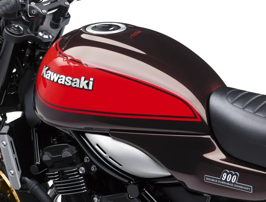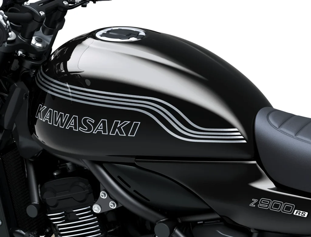 值得一提的是,在現行款的 Z900RS CAFE 中,油箱上採用了向 Kawasaki 傳奇三缸 Mach 系列(H1/H2)Kawasaki 傳奇車款「Mach 系列」致敬的彩虹拉線圖案。中央的「KAWASAKI」標誌採用轉印貼紙,透過透出底層車色的設計,營造出獨特的存在感。
