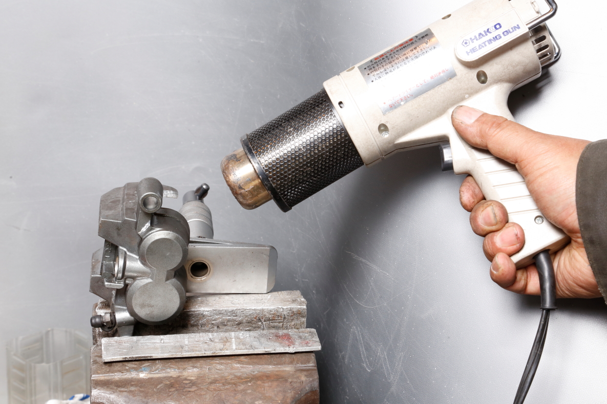 ▲如果卡钳活塞很难拆卸,请在拆卸煞车油管之前,一定要用液压将其推出。若不能正常将活塞推出,则将其浸泡在热水中或用热风枪加热,让煞车油被加热而软化。