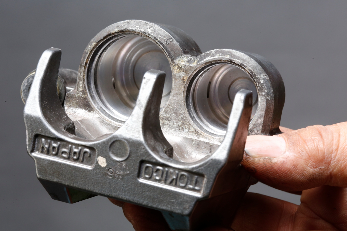 ▲KAWASAKI ZEPHYR 在已经存放了数年没有骑乘的情况下,握紧煞车拉杆后前煞车处于生硬的卡顿状态,制动卡死的原因不仅是这里提到的卡钳密封问题,而且还包括卡钳的来令片插销和主缸活塞沉积物粘附的问题所导致。