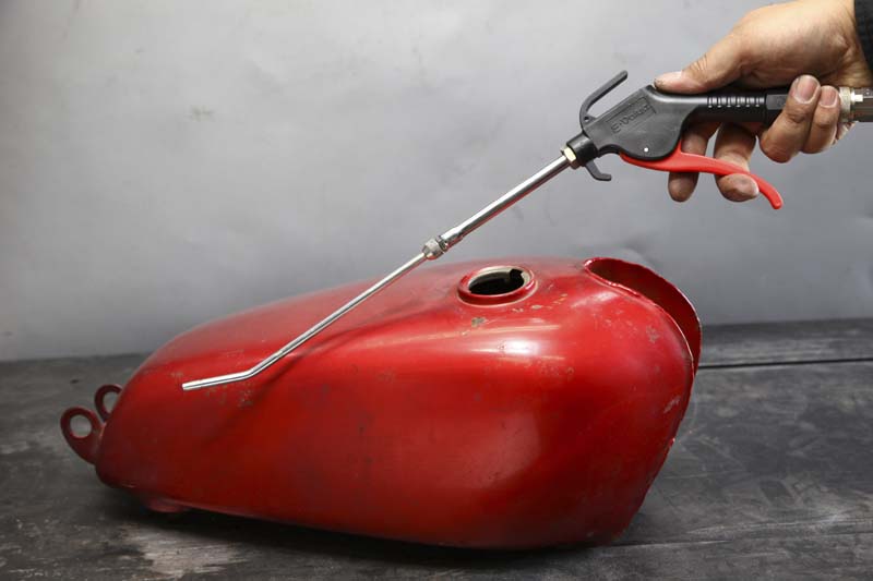 ▲用中性清洁剂或市售的脱脂清洁剂大致清除油箱内部的污垢后,将自来水倒入油箱中,使用长气嘴喷枪在油箱内部吹入空气,使油箱内部的液体翻滚达到冲刷效果。。