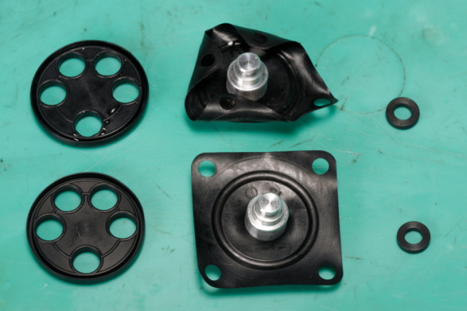 ▲KawasakiZ1000J的燃油阀内部零件都是以零件的形式提供的,包括膜片、O型圈和阀杆垫片,即使是现在,除了O型圈外,这两个部件仍然可以买到新的。