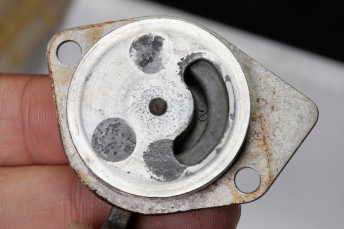 ▲除了膜片之外,杠杆垫圈的状况也是导致燃油旋塞漏油的原因,从汽油箱中的ON管和RES管流向阀座的汽油,通过操纵杆后侧的凹槽导入汽缸。最常见的杠杆形状是一个圆盘,里面有几个孔。