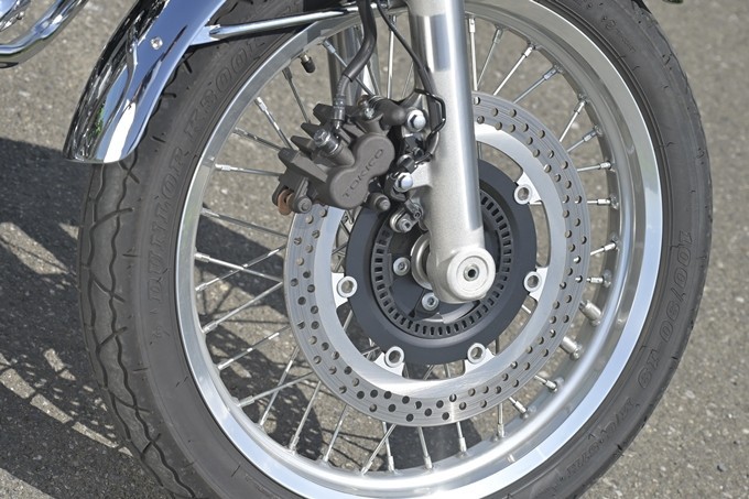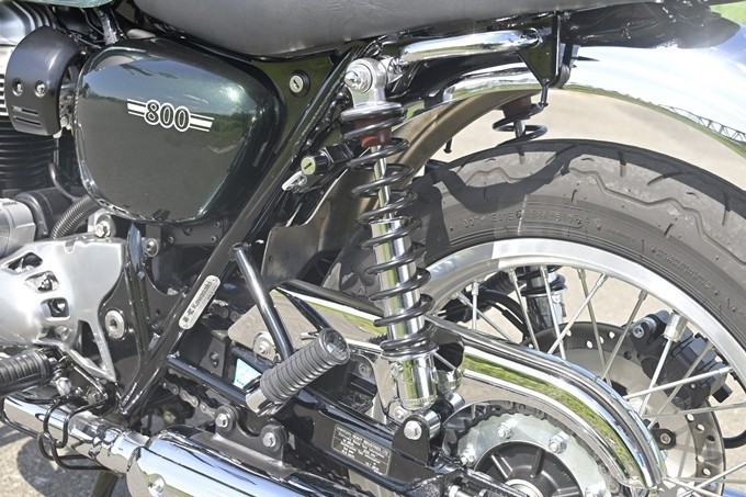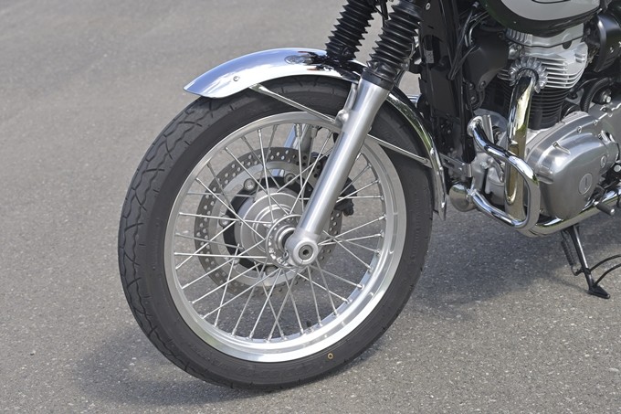 不同于相同家族的W800 Street、Cafe采用18吋前轮,W800采用的轮胎尺寸为前100/90-19、后:130/80-18,较大的轮框可以带来更经典、更壮硕的视觉感受,虽然尺寸与旧款相同,但原厂配胎已更新为Dunlop的K300GP,且前叉底部也经过重新设计,试图创造出更加经典及沉稳的车身外型。