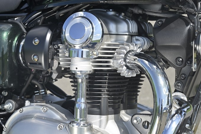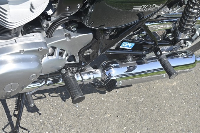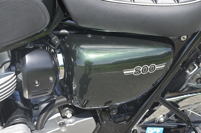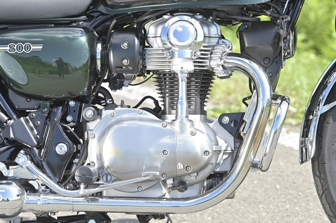 W800搭载的,是一具排气量773cc的气冷式四行程SOHC 4汽门并列双缸引擎,最大马力38kW/6,500rpm、最大扭力62Nm/4,800rpm,这颗垂直于地面的双缸引擎采用360度曲轴,360度曲轴代表着两个汽缸的活塞是同时上下作动,因此强调了垂直并列双缸引擎的股动感,而且我个人觉得这种鼓动感比旧款更突出,这应该跟为了因应EURO 5标准所做的变动有所关连。