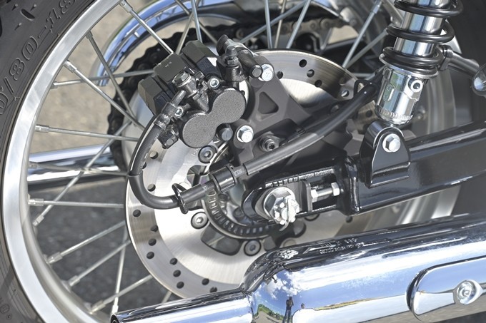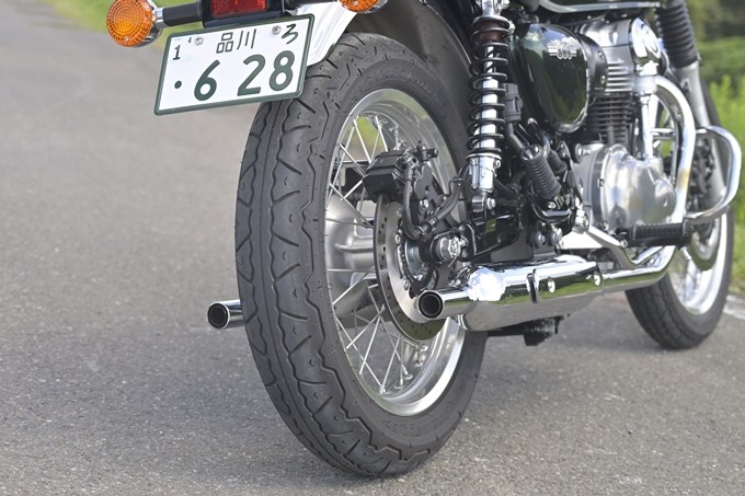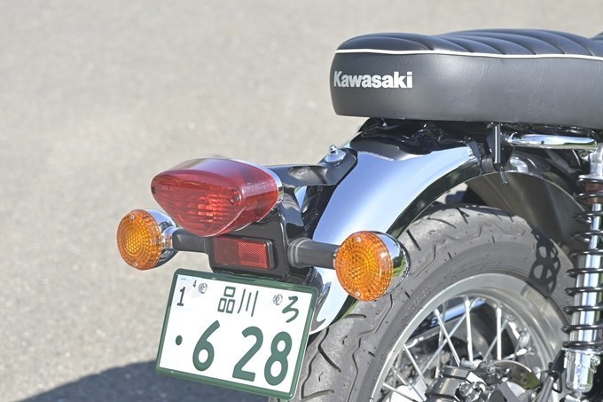 镀铬的前后土除可视为是W800不可或缺的特色,所以在新的W800上当然也能看到,且新款W800将旧款安装在坐垫旁的后方向灯移到尾灯旁,这个小改变让骑士要安装马鞍包等变得更加容易。