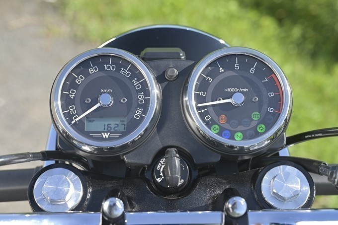 W800的仪表板采用经典的双筒型指针式转速/时速表,左侧为刻度至180km/h的时速表,下方还有一个小的液晶仪表,可以切换显示时钟、里程及单次里程,左侧则是从7000rpm开始进入红线区的转速表,搭配下方的各类指示灯号,值得注意的是W800并没有油量表,仅只有一个低油量警示灯,亮灯时的残余油量约为3.8公升。