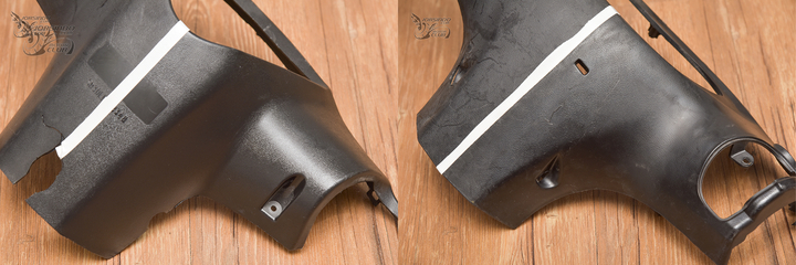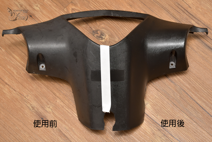 为了快速分辨成效,我们将同一块塑料件分成左右两边,如此一来就能立即比较不同方式的效果。当然,在比较前还是找素材来做实验比较保险,因此到所谓的凯汰场 ( 或称杀肉场 ) 找来两块塑料件进行实验。而本次共有三种方式来尝试将塑料件还原成原色,分别是采用塑料还原剂、塑料喷漆以及火烤,三种方式属于较容易施作的手法,因此只要注意环境安全都可以放心施工。