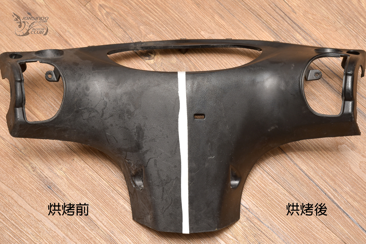 从图中可看到右半边经过烘烤后有恢复塑料原色,不过在纹路方面因为火侯的大小会有所差异,而且经过烘烤后虽然回复原色,但是已没有新品般的光泽,同时还有点黏手的现象产生,因此还需要多上一层透明漆才会比较理想。