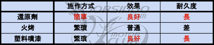 细看两种方式的结果,会发现使用还原剂的效果卓越且光亮,加上施作简单又安全,因此较为理想。加上烘烤塑料件又会产生有害气体,如果塑料件的状况不是严重白化,基本上不需要使用火烤来复原。