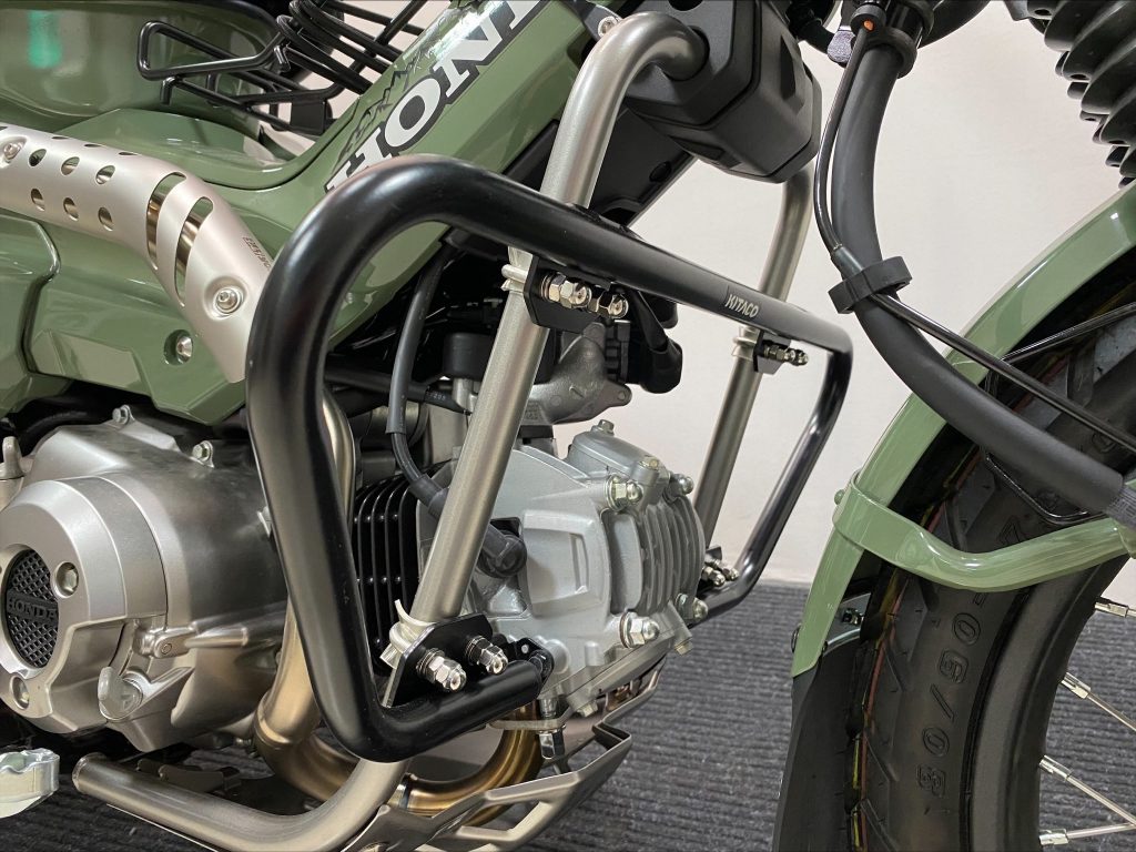 CT125的车重不算重,但由于车主是女生,在双脚的触地性不像是男生那样惬意,而且如果遇到林道骑乘时就算是男生也很容易遇到倒车的状况,KITACO这组保杆的大小与形状与CT125搭配起来不会很突兀,真的发生意外时也可以有一定保护车身与双脚的功能。