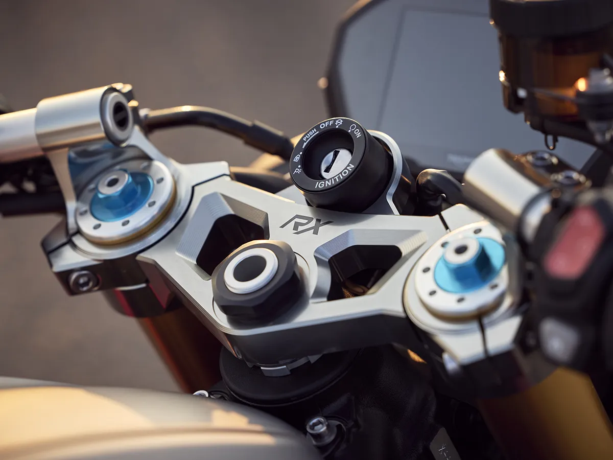 - 配备 Öhlins 制 NIX30 前避震。上三角台以雷射蚀刻了“RX”标志。
