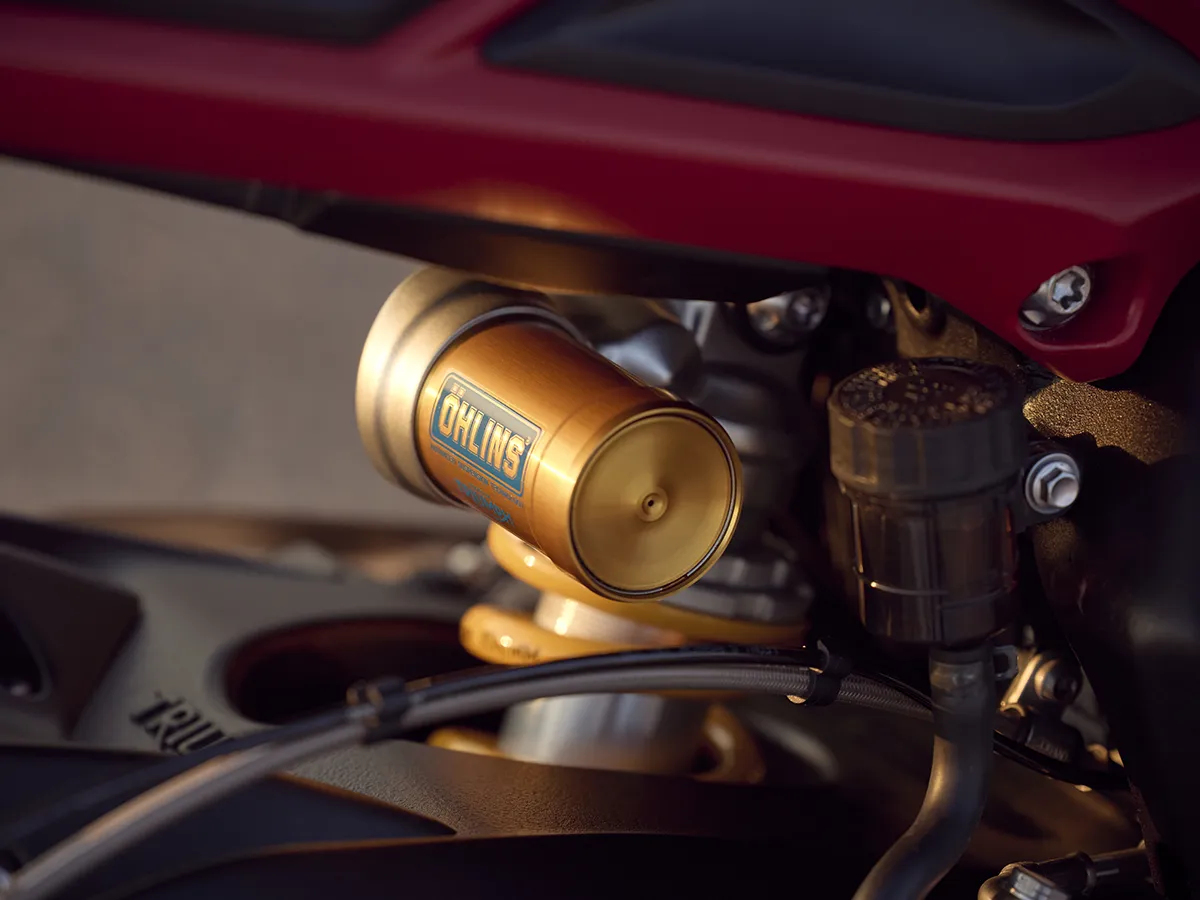 - 后悬吊配备了 Öhlins STX40 Piggyback 全可调式后避震器。