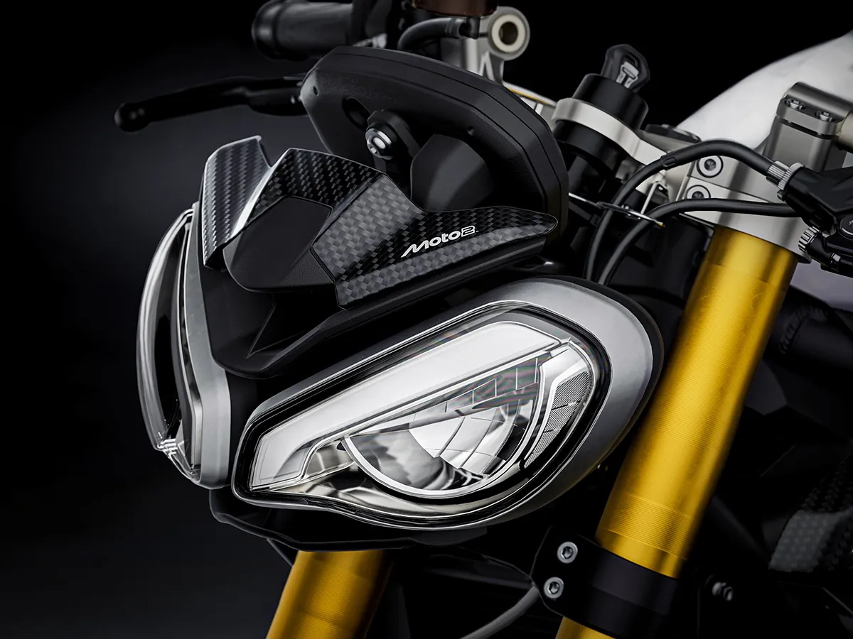 - 安装在头灯上方的头灯整流片(Headlight Finisher)为专属的碳纤维制品,并印有 Moto2™ 的标志。