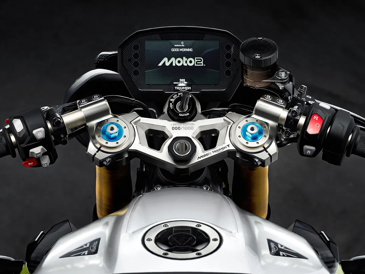 上三角台采用CNC铝合金削切加工并刻有独立序号和 Moto2™ 标志,TFT 仪表亦具有 Moto2™ 专属开机画面,展现其其限定版及收藏价值。
