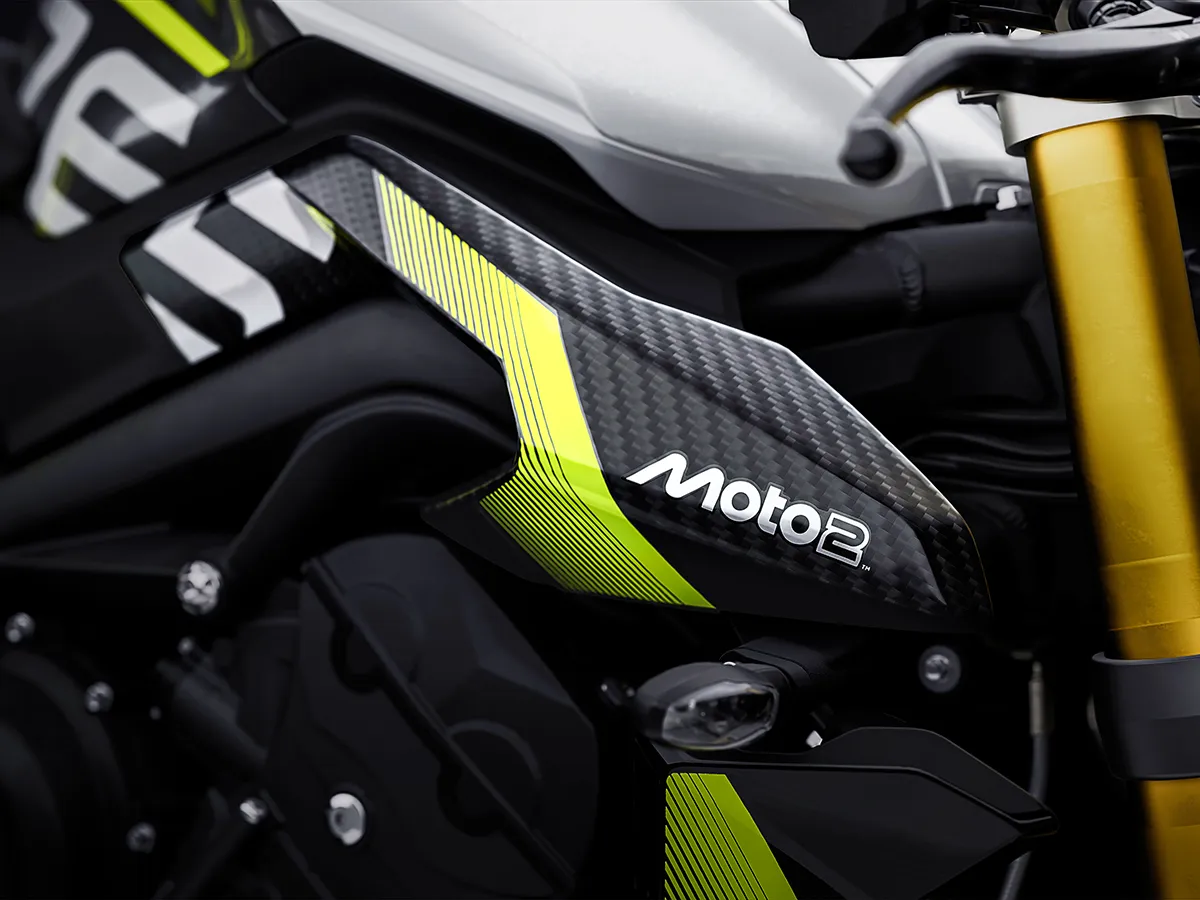 “Street Triple Moto2™ Edition” 采用大量赛车启发的顶级细节,包括 碳纤维侧盖、前土除(前挡泥板)、下整流罩、排气尾盖,座垫印压 Moto2™ 标志与止滑纹路、透明尾灯、排气管上刻有 Moto2™ 标志。车色提供 Mineral Grey (矿物灰) 和 Crystal White (水晶白),并搭配鲜明的 Triumph Performance Yellow 后副车架与轮框饰线,完整呈现出独特的赛事风格。