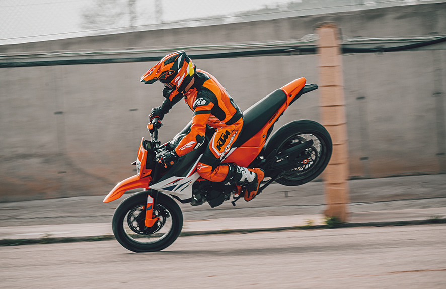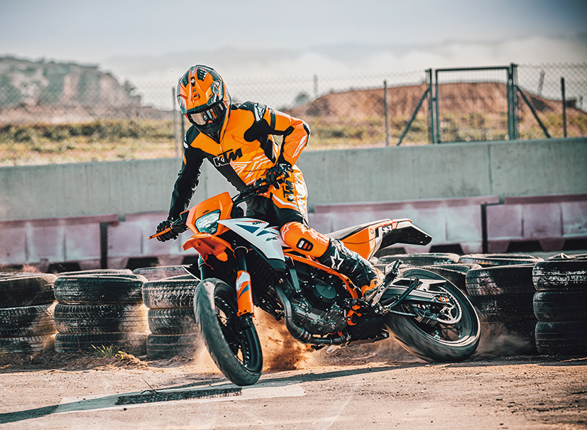 390 SMC R天生就系贪玩嘅车种-Supermoto(滑胎车)。呢种源自欧洲赛车文化嘅混合型电自行车,完美结合咗越野车(Motocross)嘅高离地距同长行程避震,并配上公路车嘅17吋轮框、街胎同埋强力制动。作为一辆原生厂车,最大特色就系可以喺沥青路上尽情“滑后轮”(Rear slide),又可以轻松跳上路肩或者应付不平路面。KTM 390 SMC R定位系“入门级真・Supermoto”,并唔系街车改装版,而系从头到尾为Supermoto乐趣而生。