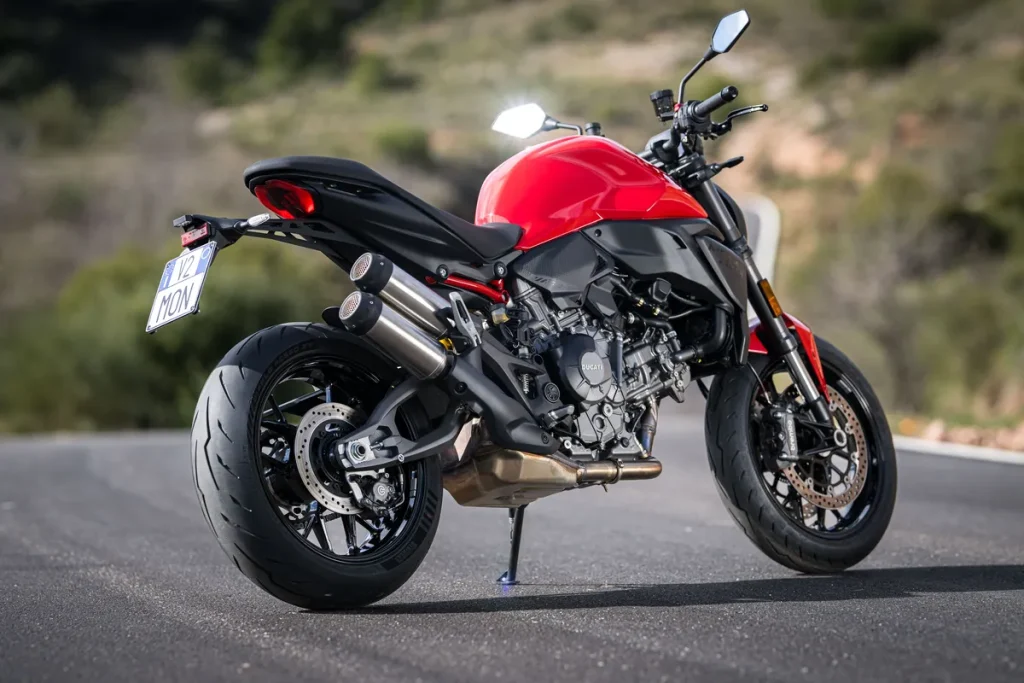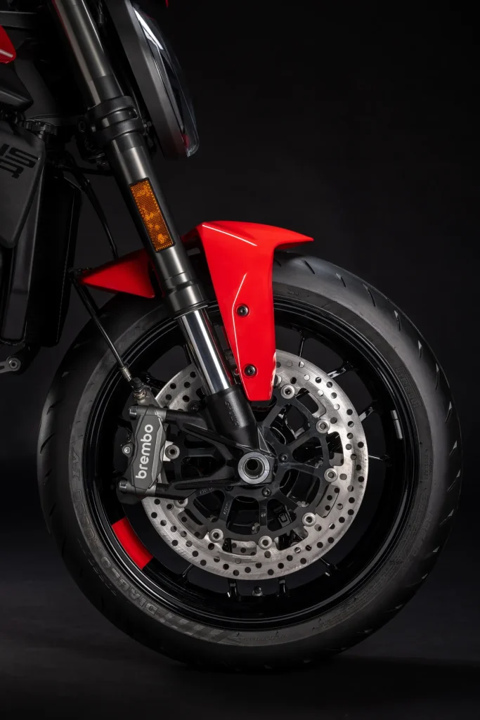 车体采用引擎作为受力成员的单体式结构。导入源自 Panigale V4 设计理念的轻量化双边式摇臂(非单摇臂设计),搭配 SHOWA 制避震系统,使干燥重量仅 175kg,比旧款减轻了 4kg。煞车部分选用 Brembo M4.32 辐射对向四活塞卡钳搭配 320mm 双碟,轮胎则配置 Pirelli“Diablo Rosso IV”,提供强大的抓地力。