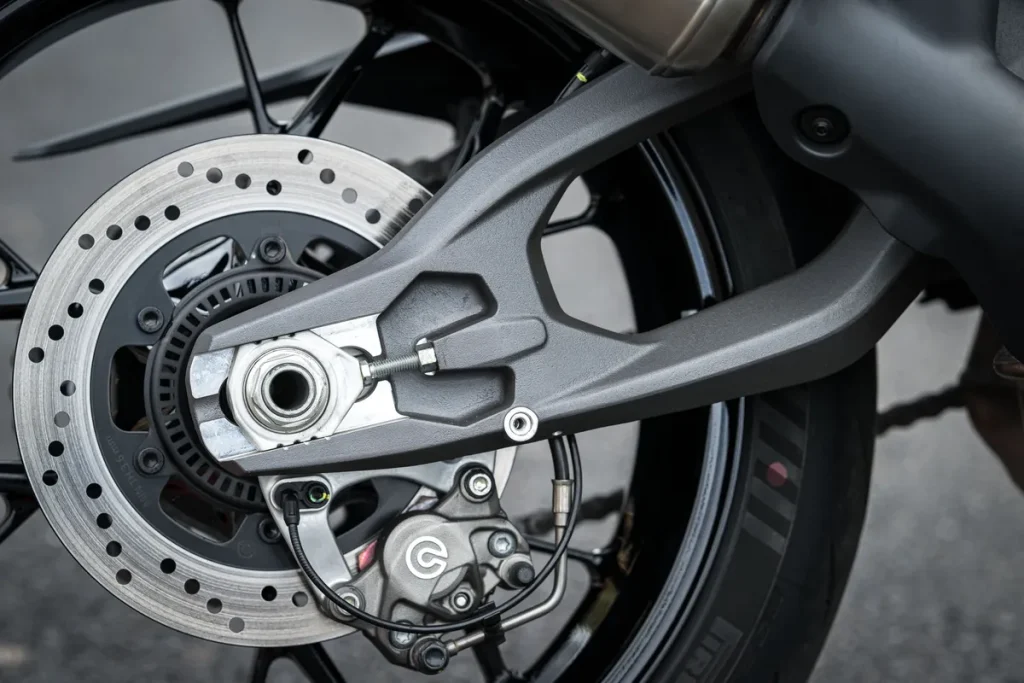 后煞车则由 φ245mm 单碟盘搭配双活塞卡钳。搭载前后独立作动的双通道 ABS 系统,安全面也毫不马虎。