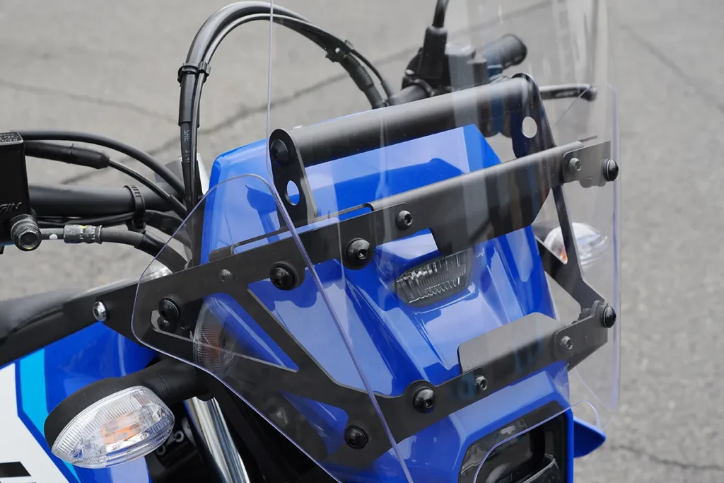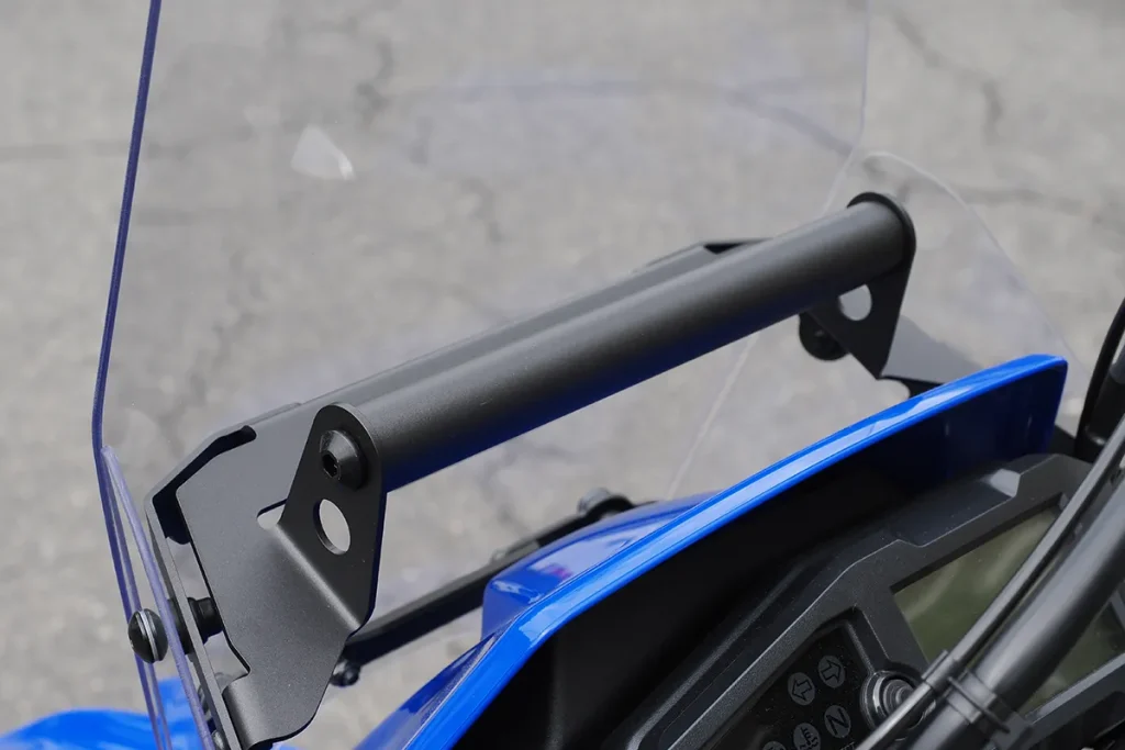 高风镜可提升高速骑乘时的防风效果,内建 22.2Φ 导航/配件支架,可用于手机架或智慧型仪表等设备安装。