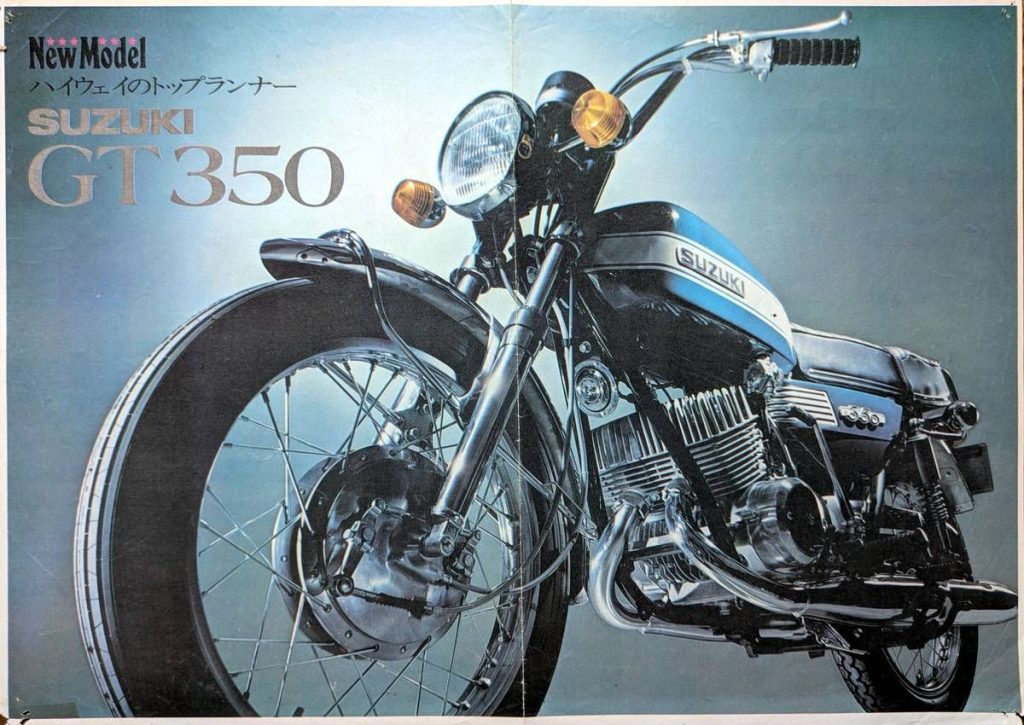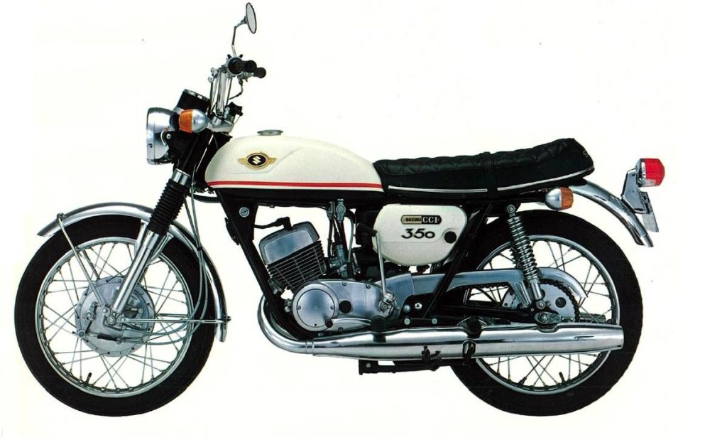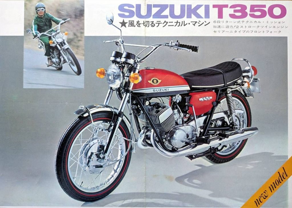 1969年,SUZUKI 推出 T350,搭载空冷二行程二汽缸引擎与双摇篮车架,并采用当时先进的6速变速箱。