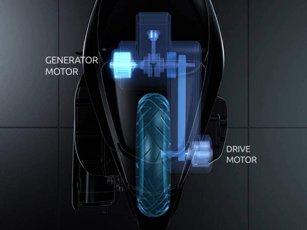 Yamaha此次发表的是首款采用新技术“SPHEV系统(Series Parallel Hybrid Electric Vehicle)”的速克达(绵羊仔)。不仅配备了常规的单缸汽油引擎,还配备了双马达混合动力系统,包括位于后轮轮框上的驱动马达以及安装在曲轴上的发电马达。