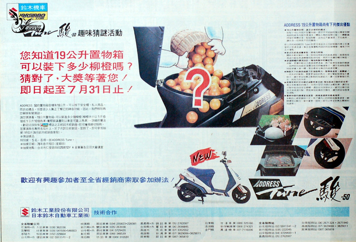 為了表現 19 公升的車廂容量有多大(還真的蠻大的),當時鈴木機車還特地刊廣告辦有獎徵答,讓大家猜猜駿50可以塞下多少柳橙,不過筆者遍尋不著到底正確答案是幾顆,如果有網友知道的可以留言回答,重重有賞!