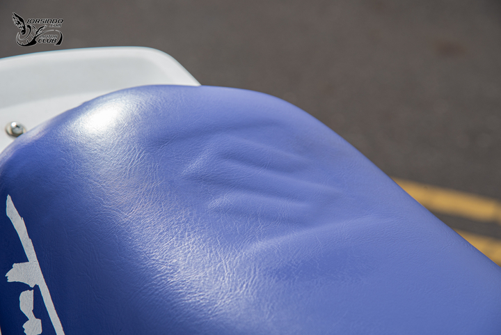 駿 50 的坐墊顏色真的就是紫色!在這個深色坐墊滿地開花的年代,很難想像當年的車款玩色玩得如此大膽,而車上這塊座墊看起來皮革如此接近新品,是透過關係找到當時生產駿 50 坐墊的供應商,請它們拿出最後的皮革餘料貼合在舊坐墊上而成,有心的車主加上好運氣,車子就能看起來亮晶晶。