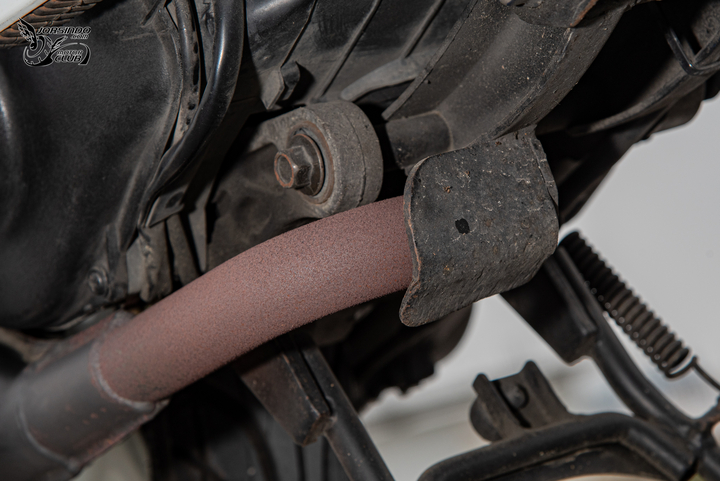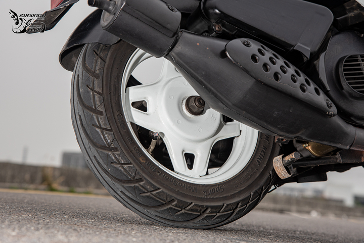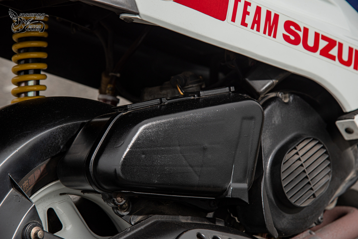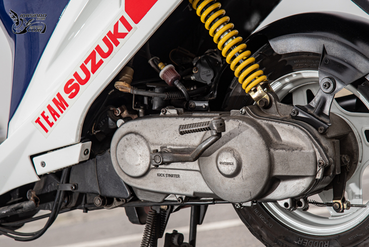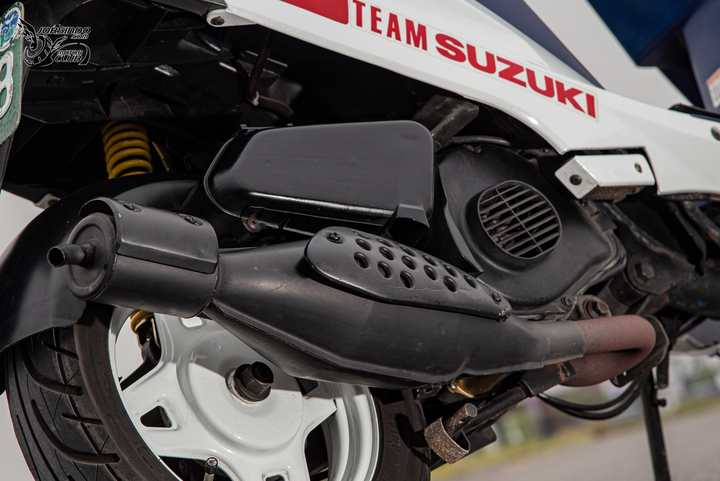排氣管部分看起來與駿 50 有些不同,經詢問後得知由於車主曾經升級過引擎,為了對應更大的排量所以沿用了金贏家 AG100的排氣管,加上當時 SUZUKI 車系的引擎吊架設計都一樣,所以直接換成排量更大的引擎在當時是很常見的升級方式。