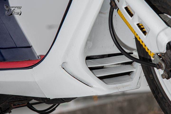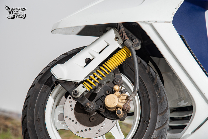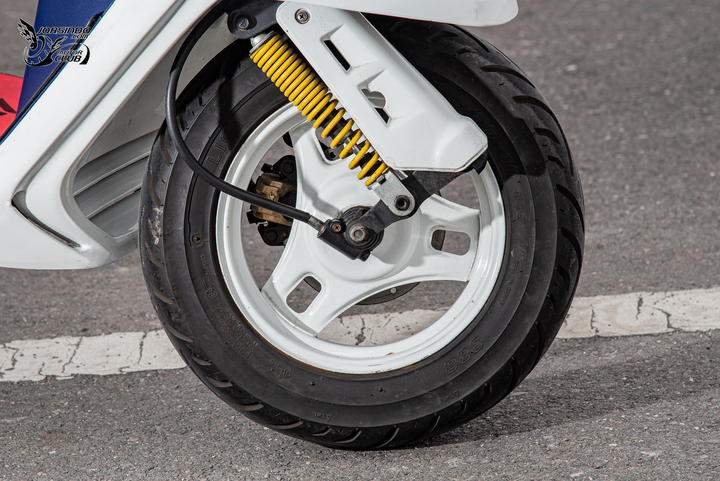 從幻象 29 到駿 50 都是採用這種多連桿式的前懸吊設計,這樣的設計在當時是非常新穎的結構,三幅的輪框設計也算是有型,而前懸吊護蓋部分,在百事可樂特仕版原始塗裝中是黑色塗裝,但車主把它換成白色的,雖然有些不同,但搭起來卻毫無違和感。