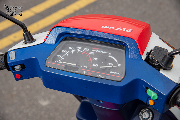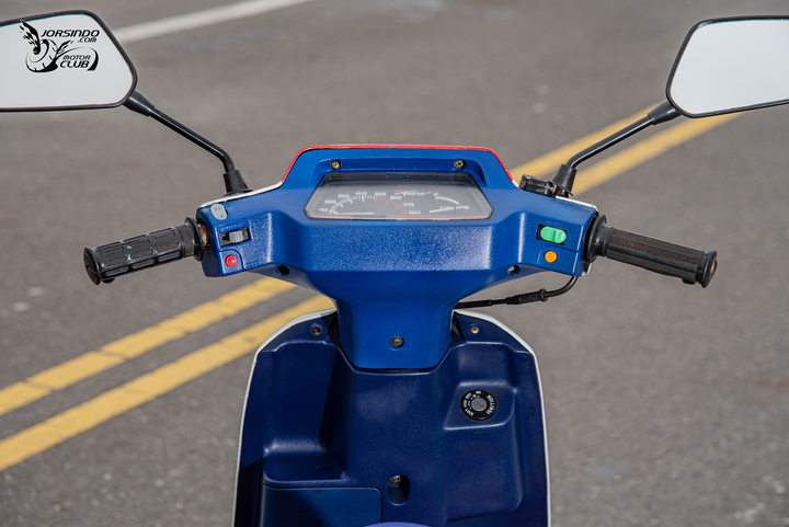 儀錶板採用當時常見的扇形指針設計,並且分為左右、下方三區,左邊為時速錶,右邊則是油錶,下面則是里程錶以及機油指示燈、遠光燈指示燈,特別注意時速錶底為 90km/h,雖然多少有些灌水,但是當時能跑這麼快的 50c.c. 車款真的不多!