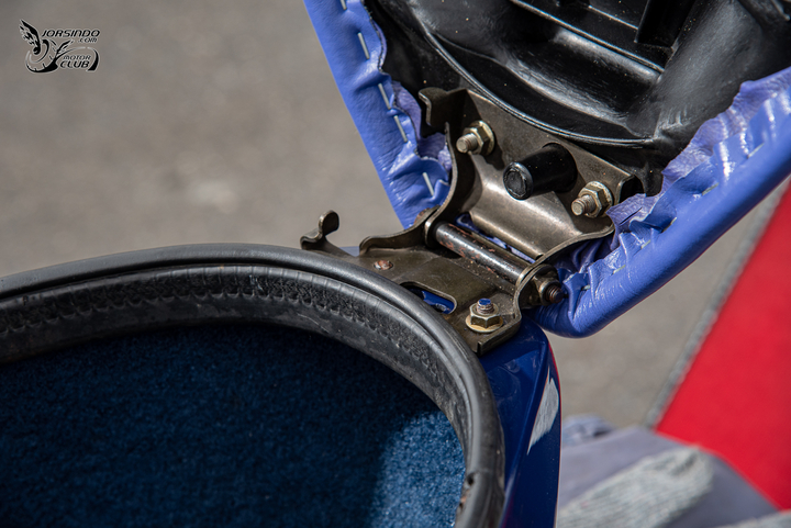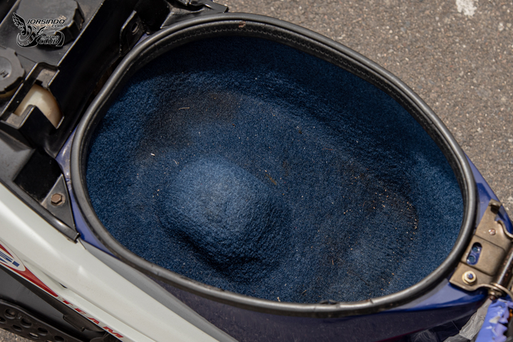 而厲害的不只有車廂容量,在那個時候駿 50 就已經有車廂燈啦!雖然因為車齡較高車廂燈已被移除,但是還是能看到坐墊前緣,在坐墊關節鎖孔處留下的車廂燈鎖固孔位。