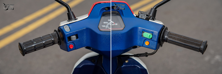 左把手總成設有遠近燈開關、方向燈開關、喇叭鈕;右把手開關設有大燈開關、電發鈕等,整體設計風格真的很有年代感,在方正中加入圓形,並且採用鮮豔的配色可說是當時設計的主流。
