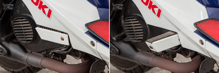 乘客腳踏採用隱藏式的設計,白色的塗裝與車身殼件如出一轍,而且旋出式的設計硬是比固定式帥上一截,不過這個部分應該是鈴木機車針對台灣市場所做出的設計修改,由於日本的 50c.c. 不能載人,因此在日版的 Address Tune 上是沒有乘客腳踏的。