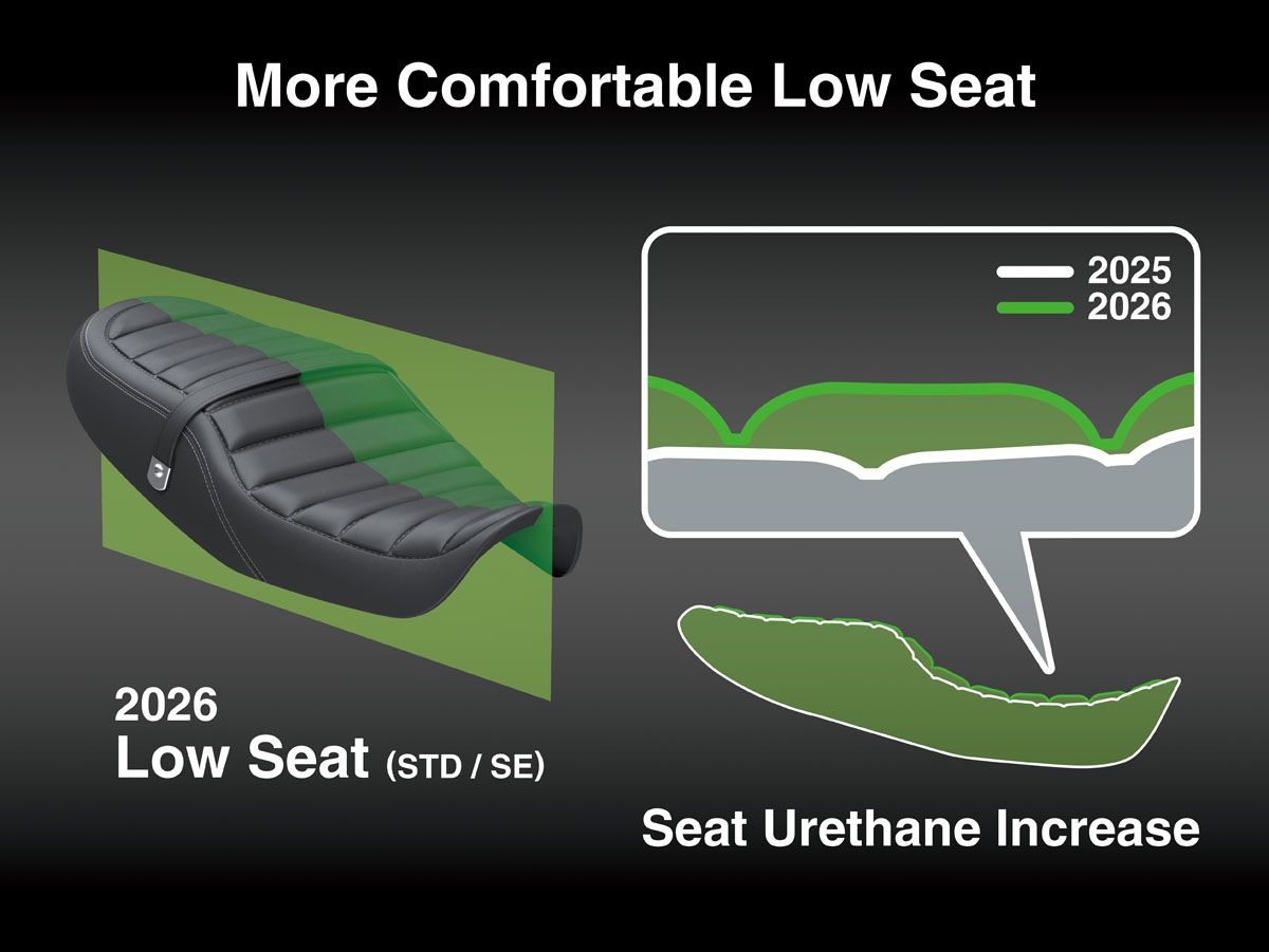 把手、坐墊調整:手把位置更窄且更低,握位向內移動50mm、並下移38mm,更具運動感。Black Ball Edition 與 SE 配備了進化版的新型「ERGO-FIT 低座墊」,且坐墊皮重新設計,內建厚實的聚氨酯泡棉。雖然座高比現行款高出 10mm,但實測座椅的下沉特性讓雙腳著地性與現行款幾乎相同(Cafe 版座墊維持原樣)。