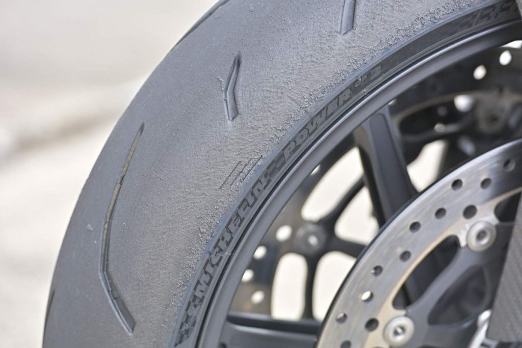 測試用的 BMW M1000R 是擁有最大馬力 218ps 的超級街車。雖然大馬力車款對輪胎的損耗很大,但在賽道上行駛超過 1000 公里後,它依然能保持著足以在賽道使用的性能。當然,磨損是必然的,性能相較全新品也會有所下降,但衰減的過程非常緩慢。在高抓地力輪胎之中,我覺得它的耐磨耗性能異常優異。