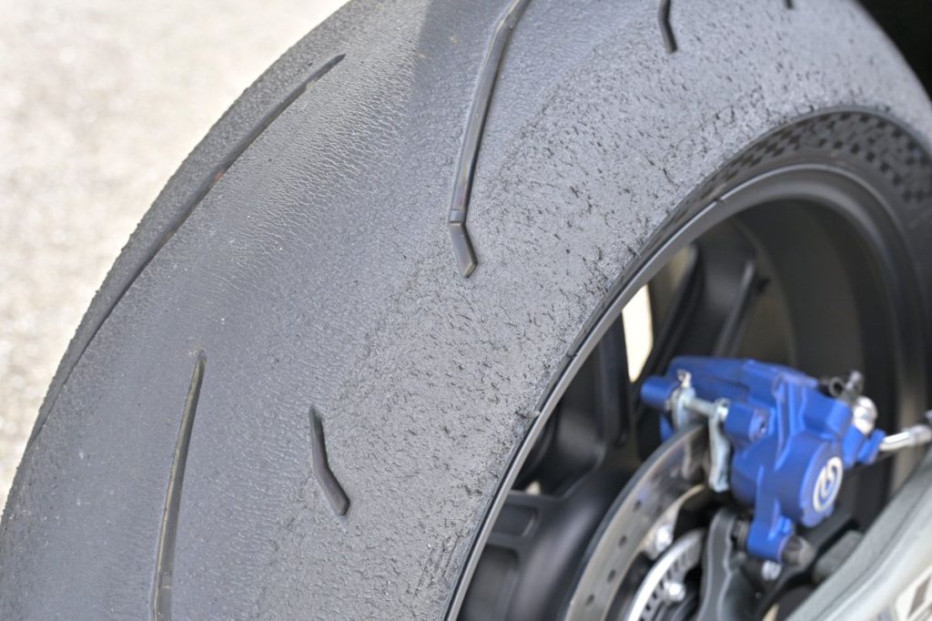 事實上,我在大約行駛 1400 公里時,換上了第二套 POWER GP2,這是因為測試車輛 M1000R 改款,我們不得不換騎新型號。理由僅是「因為車既然是新的,輪胎也換新的吧……」,絕不是因為輪胎性能衰退(※)。第二套也已經跑了約 1300 公里,所以使用 POWER GP2 的總里程大約是 2700 公里。