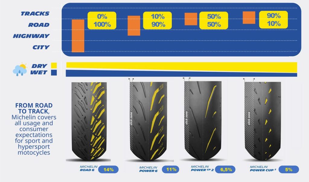 MICHELIN 道路用輻射層/放射層 (Radial Tire)的示意圖。由左至右分別是:旅行取向的 ROAD6、運動胎 POWER6、本次介紹的 POWER GP2,以及賽道為主的 POWER CUP2,圖中以百分比標示了賽道(TRACK)與一般道路(ROAD)的使用定位比例。