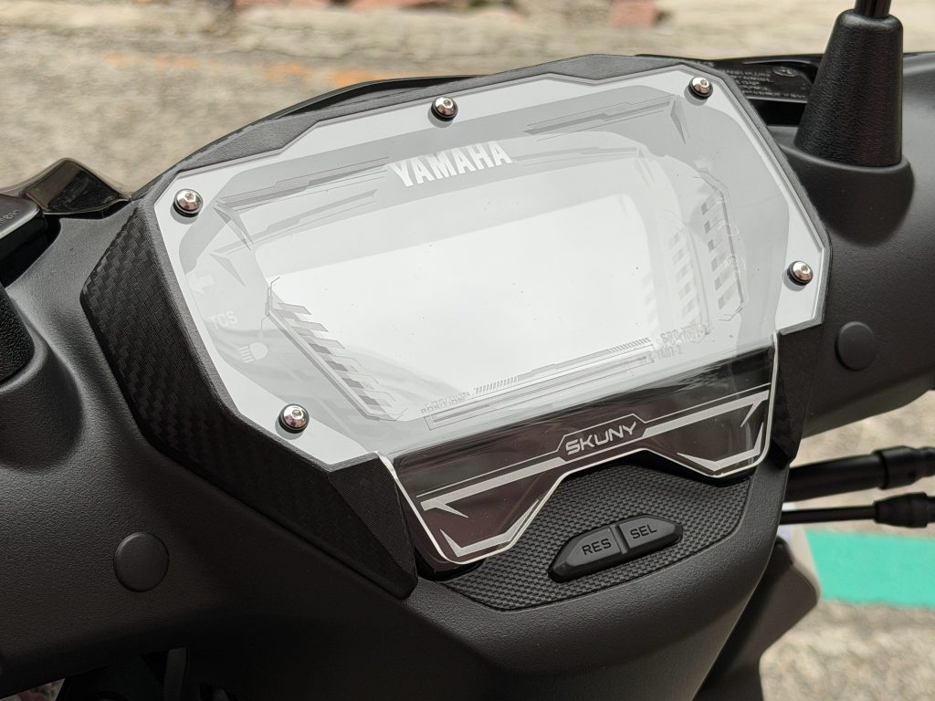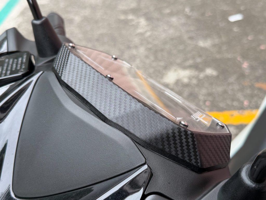 對於勁戰七代的車主來說,儀表防護通常只有「貼膜」一個選項,但 SKUNY 提供的「原型裝甲」則完全顛覆了這個邏輯。這是一款採用高品質樹脂模具開發的硬式保護殼,它不直接黏貼在螢幕上,而是透過精準的卡位設計,在儀表上方加蓋一層堅固的屏障。這種設計除了能從物理層面徹底隔離飛石與擦傷,其加高的外緣線條更在儀表上方自然形成一道遮光屏,能顯著降低外部強光造成的螢幕洗白感。安裝後,儀錶板不再只是一面平整的玻璃,而是展現出充滿機械感的立體結構,兼具了實用機能與裝甲視覺。