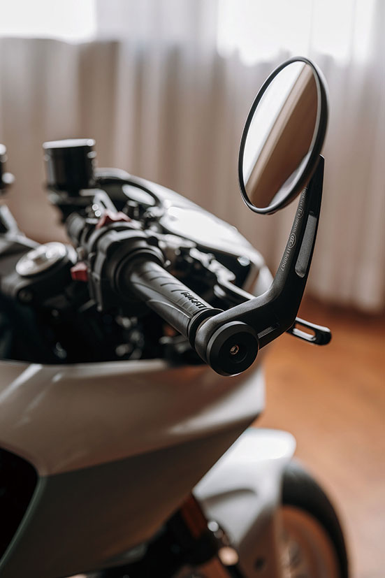 此外,低俯的分離夾式把手、把手末端睹後鏡,以及短促收窄的單座尾殼,完全確認了她純粹的跑格血統。車身更用上大量高規格鋁合金部件,如煞車與離合器拉桿、油杯、腳踏,並標配Rizoma鋁合金油缸蓋。身為限量版,每台車的轉向柱上方均鑲有專屬雷射鵰刻的獨立編號銘牌,交車時更附贈官方認證證書及專屬禮盒,內含設計手稿與珍貴照片。
