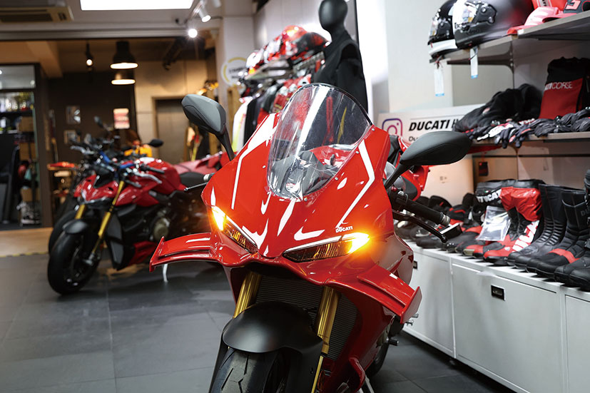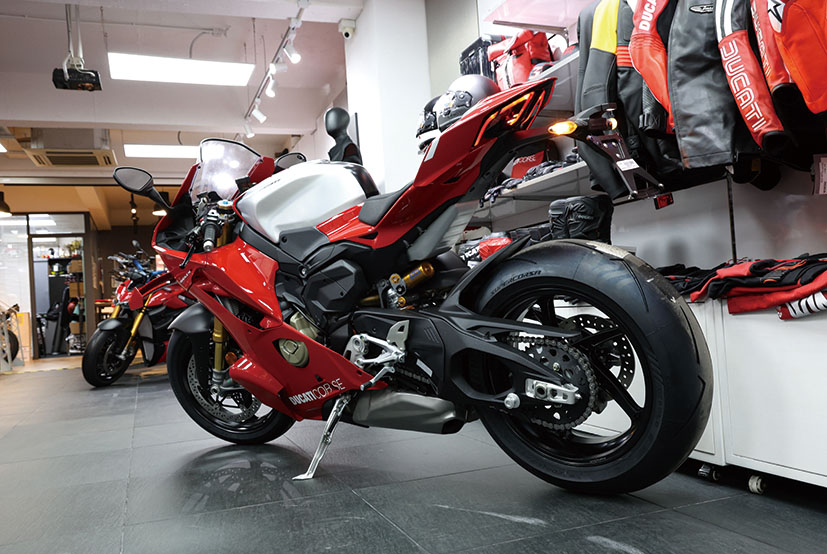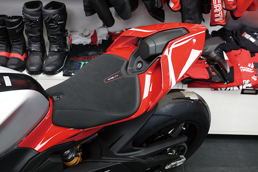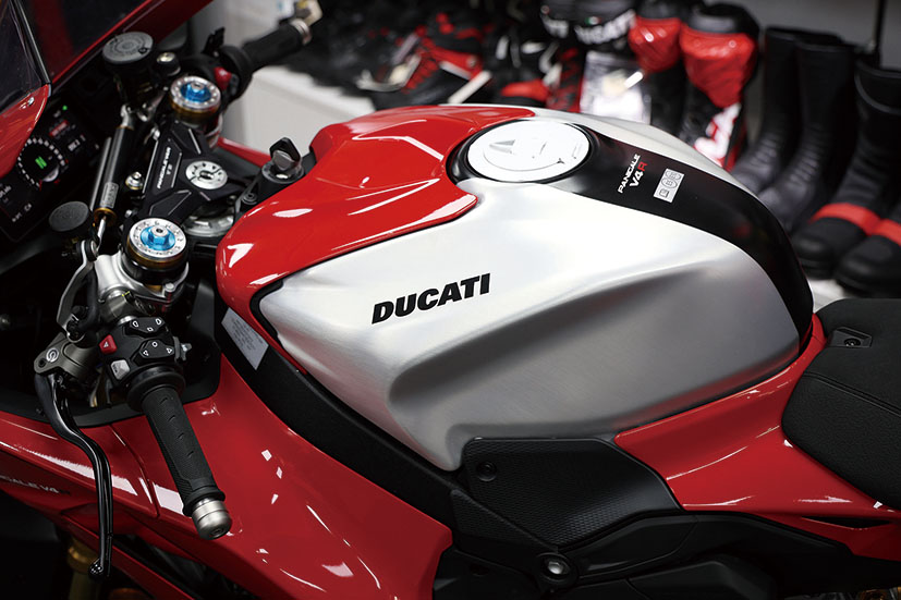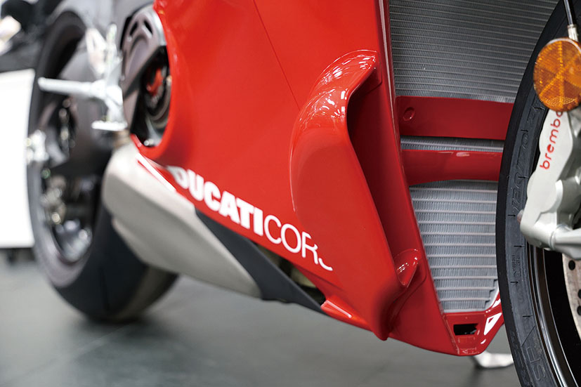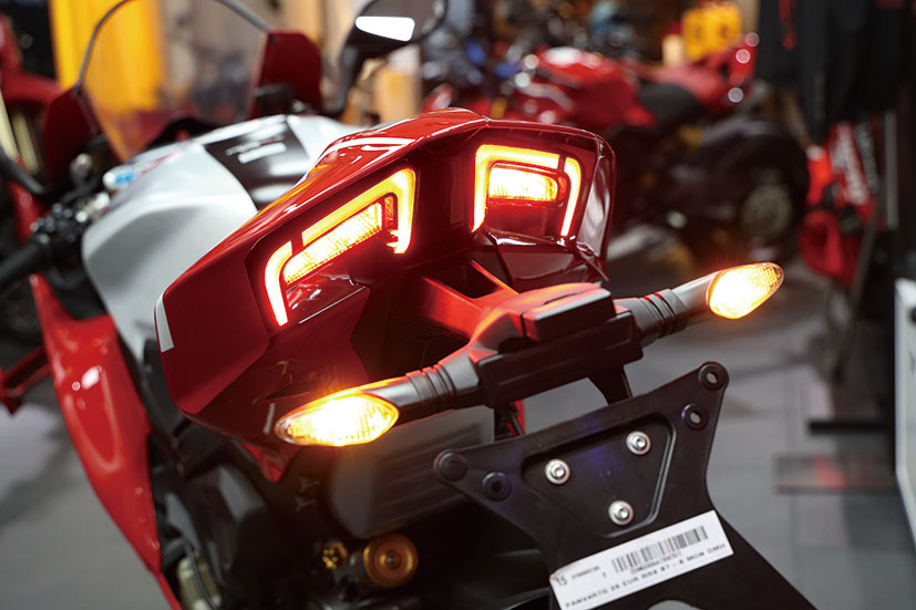 此外,兩邊下包圍增添咗名為Corner Sidepods彎道側導流罩嘅擾流套件,設計靈感來自2021款MotoGP賽車Desmosedici GP,可以令架車喺高速大傾角過彎嗰陣獲得更優異嘅車胎咬地力。全車線條經過重新設計,由深邃嘅車頭到俐落嘅車尾,凸顯出簡潔而且極致戰鬥嘅設計語言,配備鋁合金拉絲工藝嘅17L油缸,全車標配LED燈具。