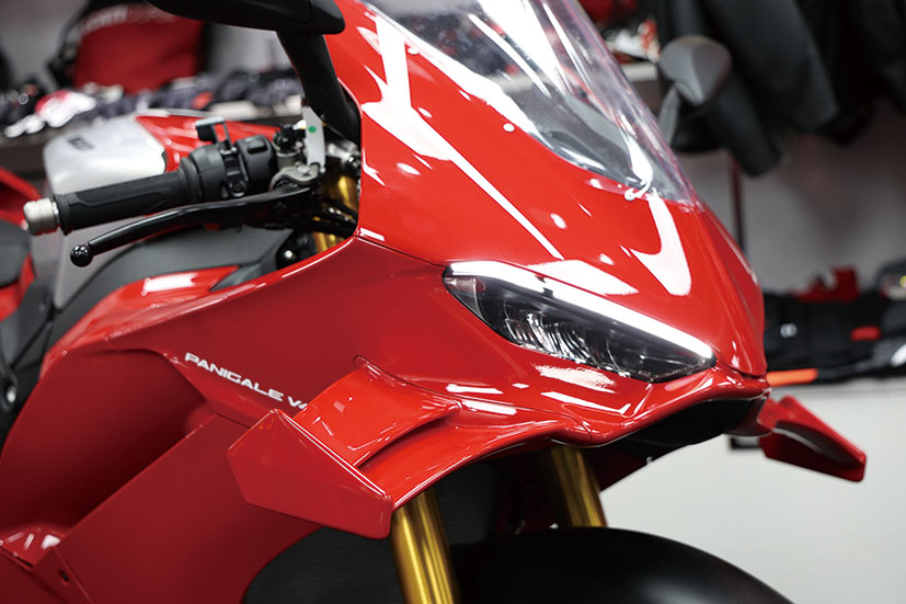 新款Panigale V4 R嘅外觀造型喺標準版基礎上,進行咗激進嘅空氣動力學延伸。大膽採用更誇張嘅定風翼設計,面積比V4 S增大咗20mm。這套系統喺時速270km/h嗰陣可以額外產生4.8kg嘅下壓力,而喺300km/h嘅高速之下,更可額外提供6kg嘅下壓力,大幅提升車身喺極端高速下嘅穩定性。