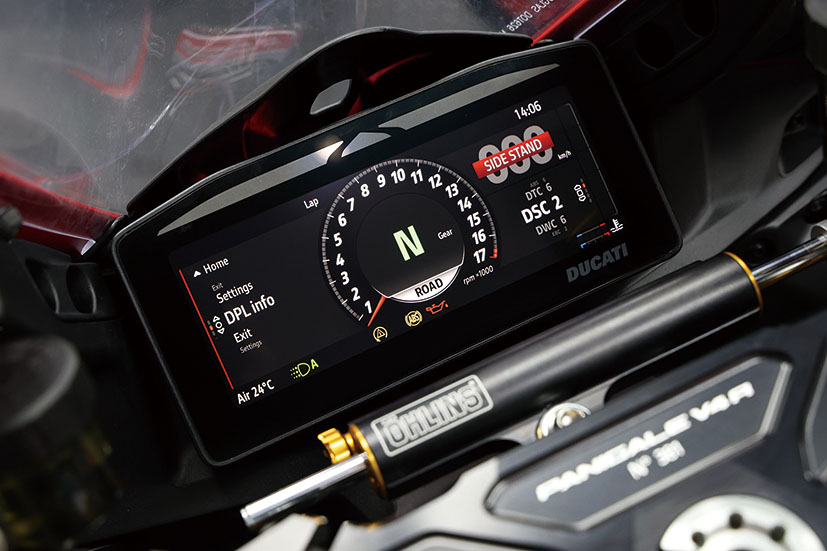 如果想喺賽道上火力全開,搭配賽道專用嘅Akrapovic鈦合金排氣喉同專屬賽道ECU調校,可以徹底釋放V4 R嘅動力潛能。啟動後,系統設定會直接同廠隊賽車睇齊,引擎反應更加純粹。錶板升級為全新6.9吋TFT全彩螢幕,比例為8:3,解像度達1280 x 480。寬闊嘅螢幕比例帶嚟更完整嘅視覺體驗,黑底介面亦確保咗極佳嘅日間辨識度。