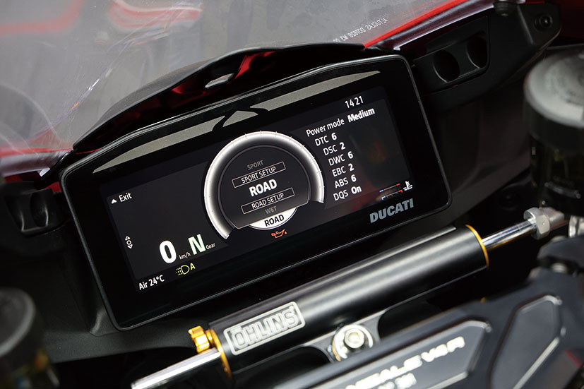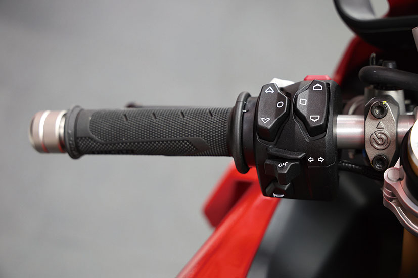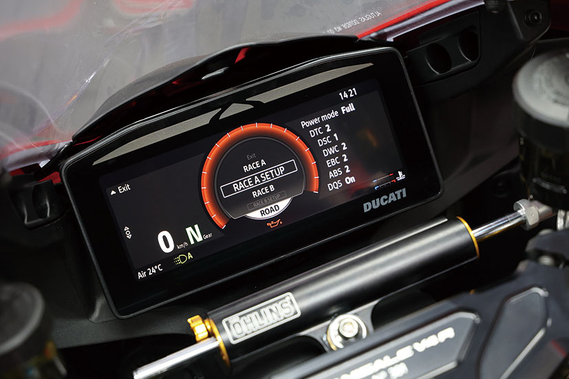 Panigale V4 R配備咗目前最全面同專業嘅電控系統,包含六軸IMU、循跡控制DTC DVO、車身狀態監測DVO、滑動控制DSC、Bosch彎道ABS、防起頭控制DWC DVO、自動車胎校準、Engine Brake控制EBC DVO、賽道迫力控制以及道路版eCBS,仲標配埋電子快排DQS 2.0。車輛提供Race A、Race B、Sport、Road及Wet五種騎乘模式,每種模式都會即時調整動力輸出同電控參數。車手可以按自己習慣進行深度自定義,亦可以隨時還原原廠設定。