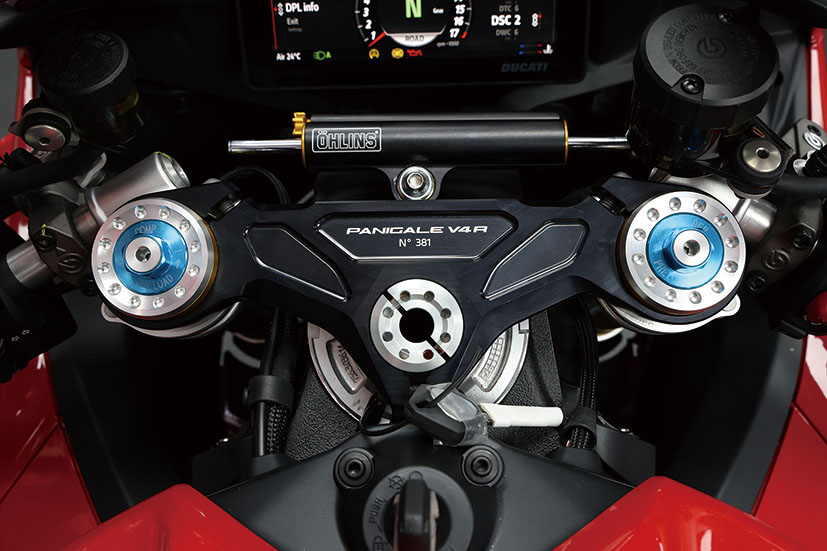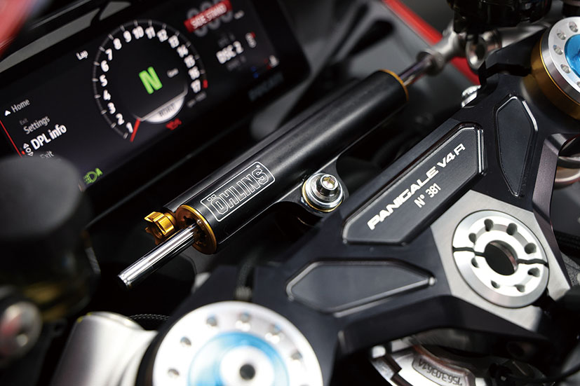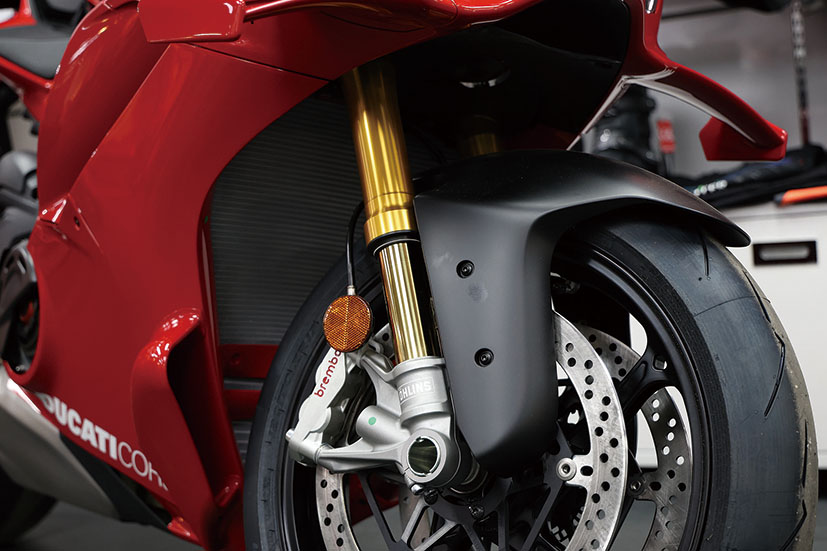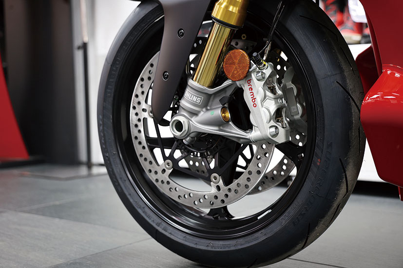 避震系統毫不妥協,前方配置全可調43mm Ohlins NPX 25/30倒立前叉,後方為全可調Ohlins TTX36氣樽式單筒避震,並首次為V4 R標配咗Ohlins SD20轉向阻尼器。迫力系統由一對Brembo Hypure對向四活塞輻射式卡鉗搭配330mm鑽孔碟負責前輪減速,尾輪就用單活塞卡鉗配245mm鑽孔碟。