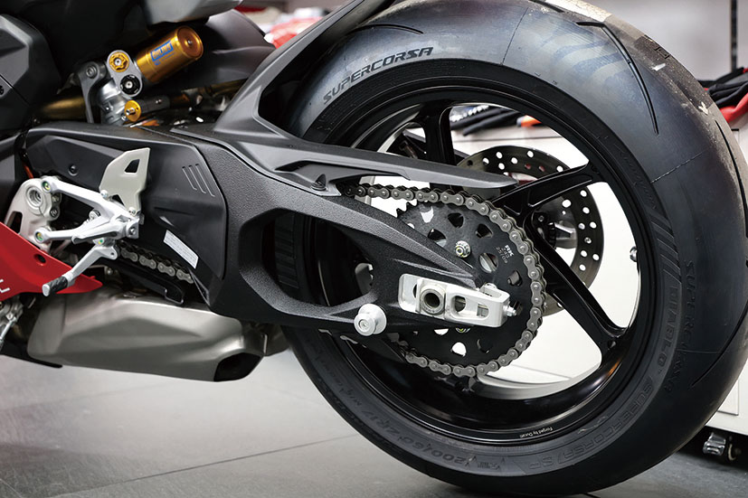 車架部分,全新鋁合金雙翼樑Front Frame車架嘅橫向剛度降低咗40%,有效提升咗最大傾角時嘅路感回饋同高速入彎嘅穩定性。尾搖臂就棄用傳統嘅單搖臂,改用剛性更佳嘅可調式鋁合金中空對稱雙搖臂,搭配輕量化鋁合金鍛造輪框及Pirelli Diablo Supercorsa SP高性能車胎。